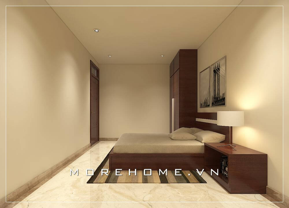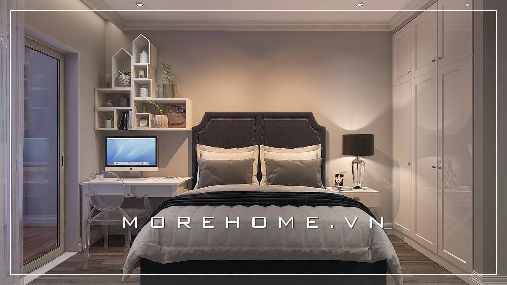 Thiết kế phòng ngủ hiện đại đơn giản, mọi đồ đạc đều được bố trí gọn gàng, vuông vắn đem lại sự rộng rãi thoáng đãng cho không gian của căn hộ chung cư