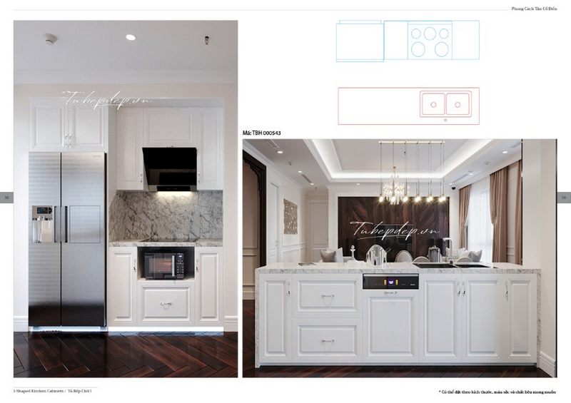 Giới thiệu đến quý gia chủ mẫu tủ bếp tân cổ điển đẹp tinh tế với sắc trắng kết hợp đảo bếp có bồn rửa tiện nghi, sáng tạo