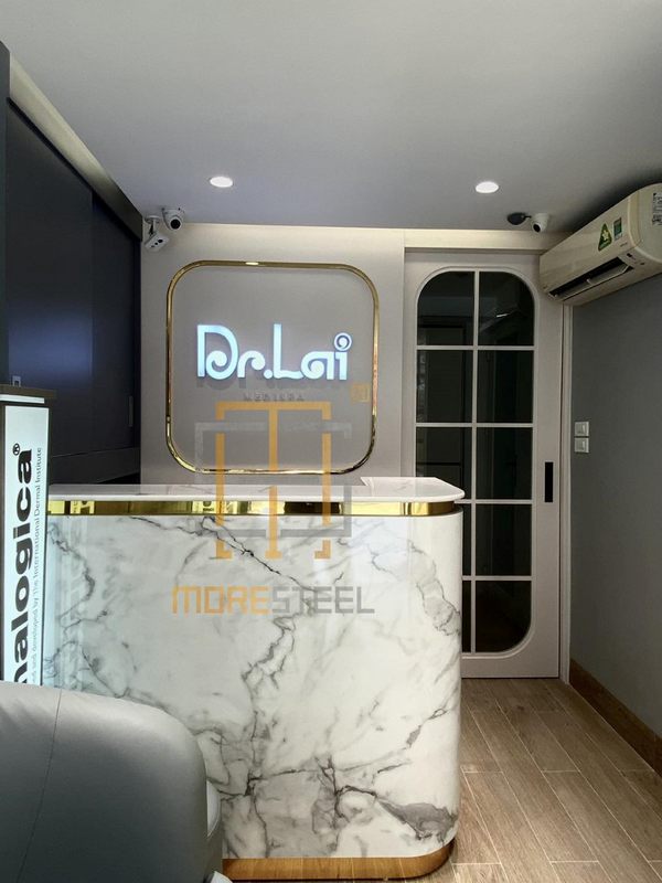 Quầy lễ tân làm bằng đá nhân tạo màu trắng vân mây cá tính, thẩm mỹ cao cho không gian