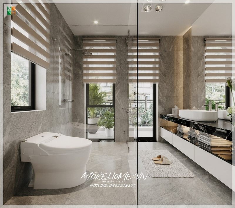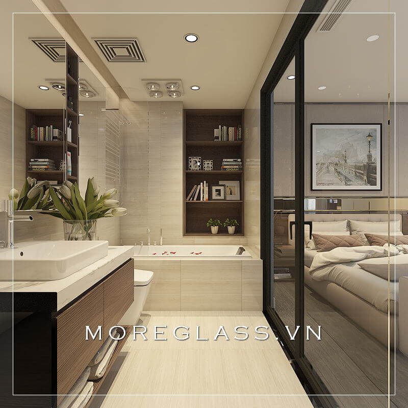 Thiết kế phòng tắm được phân chia khu vực rửa mặt, khu vực vệ sinh và khu vực tắm bồn bằng kính cường lực để tránh nước bắn ra xung quanh, giúp cho phòng tắm luôn khô ráo sạch sẽ