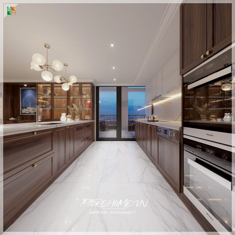 Sẽ là một gợi ý độc đáo với sự có mặt tủ bếp gỗ óc chó veneer nâu trầm kết hợp gam màu trắng sáng, long lanh từ tủ bếp trên gỗ công nghiệp acrylic và mặt bàn bếp đá nhân tạo gốc thạch anh. Sự tương phản giữa 2 sắc màu sẽ là ý tưởng tuyệt vời cho bố trí nội thất phòng bếp hiện đại cho không gian nhà phố, biệt thự.