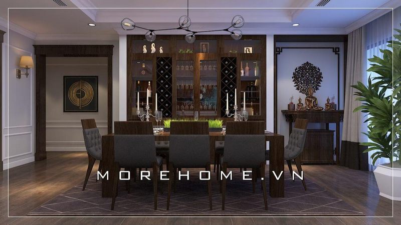 Phòng ăn biệt thự được bố trí riêng biệt, với bộ bàn ăn 8 ghế bằng gỗ óc chó tân cổ điển màu nâu bọc nỉ đệm lưng êm ái
