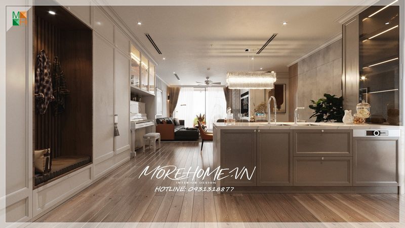 Thẳng với hành lang rộng lớn của biệt thự, nhà phố là không gian ẩm thực của cả gia đình, để sự ấm cúng và gần gũi của khoảnh khắc sum họp lan tỏa ra cả ngôi nhà.