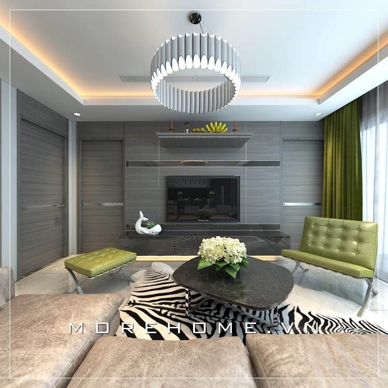 Thiết kế nội thất phòng khách hiện đại, đẹp kết hợp gỗ ốp tường tạo điểm nhấn ấn tượng cho căn hộ chung cư.
