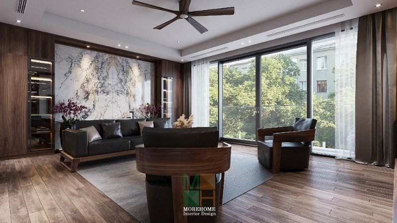 Mẫu thiết kế phòng khách cho nhà phố, chung cư, biệt thự mang phong cách hiện đại, ấn tượng, lịch lãm từ nội thất gỗ óc chó, thể hiện gu thẩm mỹ cao cấp của gia chủ