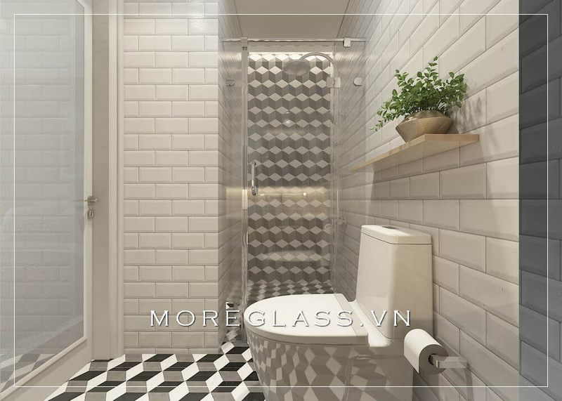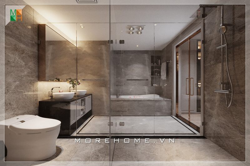 Sử dụng gạch ốp tường và gạch lát nền sang trọng và hiện đại để thiết kế nội thất phòng tắm và WC của nhà phố thông minh.