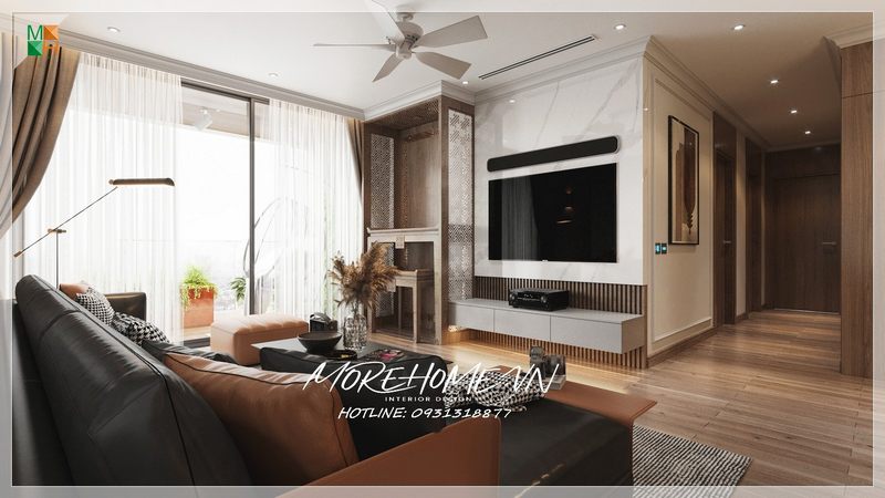Không gian phòng khách của chung cư đầy sang trọng với thiết kế tân cổ điển mang đến vẻ đẹp lịch lãm cho căn nhà.