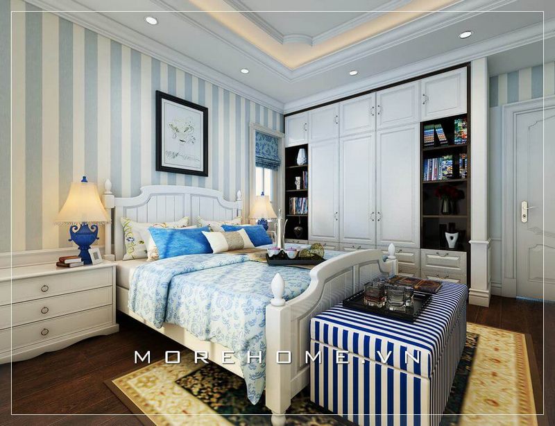 Sử dụng hai màu chính trắng và xanh, thiết kế phòng ngủ cho bé trai sẽ tạo ra một không gian đáng yêu, tinh nghịch nhằm mục đích khuyến khích bé khám phá thế giới.